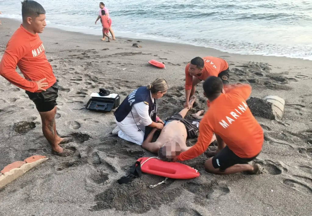Tras ser rescatado a pesar del fuerte oleaje que prevalecía en el área, requirió ser trasladado en una ambulancia de Protección Civil Estatal a la Cruz Roja Mexicana, a fin de recibir una atención médica integral.