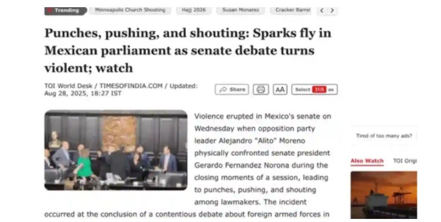En Suiza, el portal Watson llevó la noticia a su portada con el título “Políticos se van encima unos de otros en el Senado de México”.